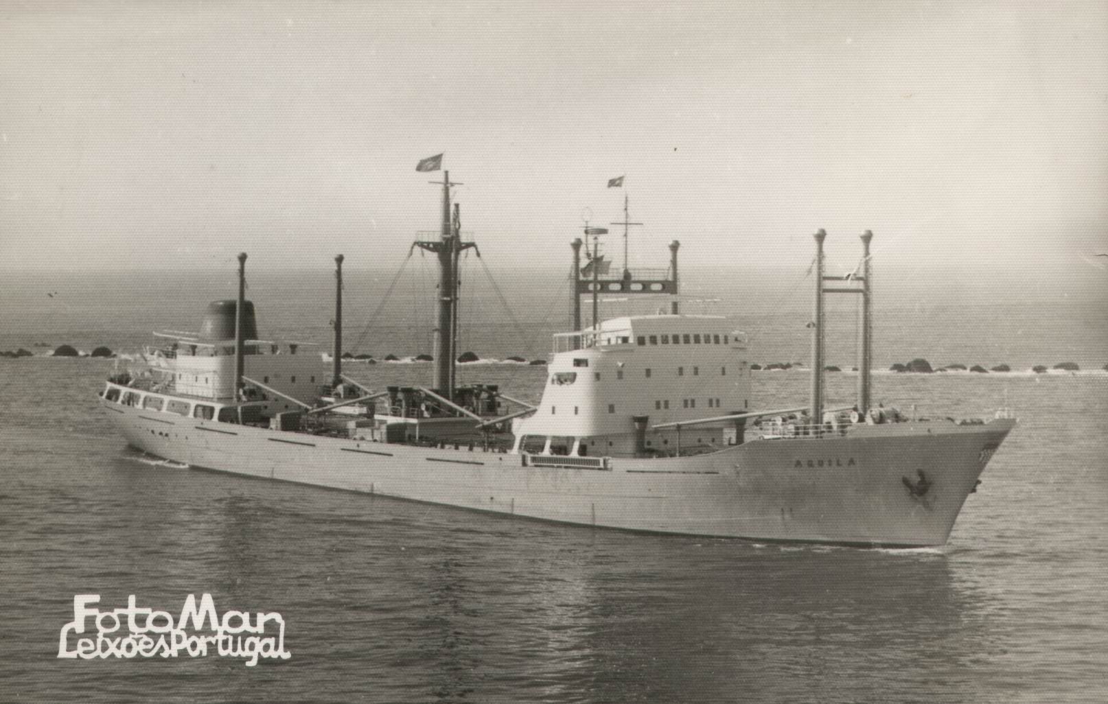 1959 lieferte die reedereieigene Adler-Werft die AQUILA an die Argo. Es war für beide Unternehmen die größte Einheit und markiert den Wendepunkt in der Geschichte der Gruppe. In den 60er Jahren begann der langsame Abstieg der Argo der mit der Insolvenz im Jahre 2002 seinen Abschluß fand. Die Postkarte zeigt die AQUILA zu Beginn ihrer Karriere, also noch im Levante-Grau. Häufig versuchten lokale Fotographen ihre Produkte an den (See)mann zu bringen, indem sie einen Probeabzug mit ihrem Logo an Bord brachten. Mein Vater war nicht sonderlich an Fotos "seiner" Schiffe interessiert - das Bild hat er trotzdem eingesteckt.