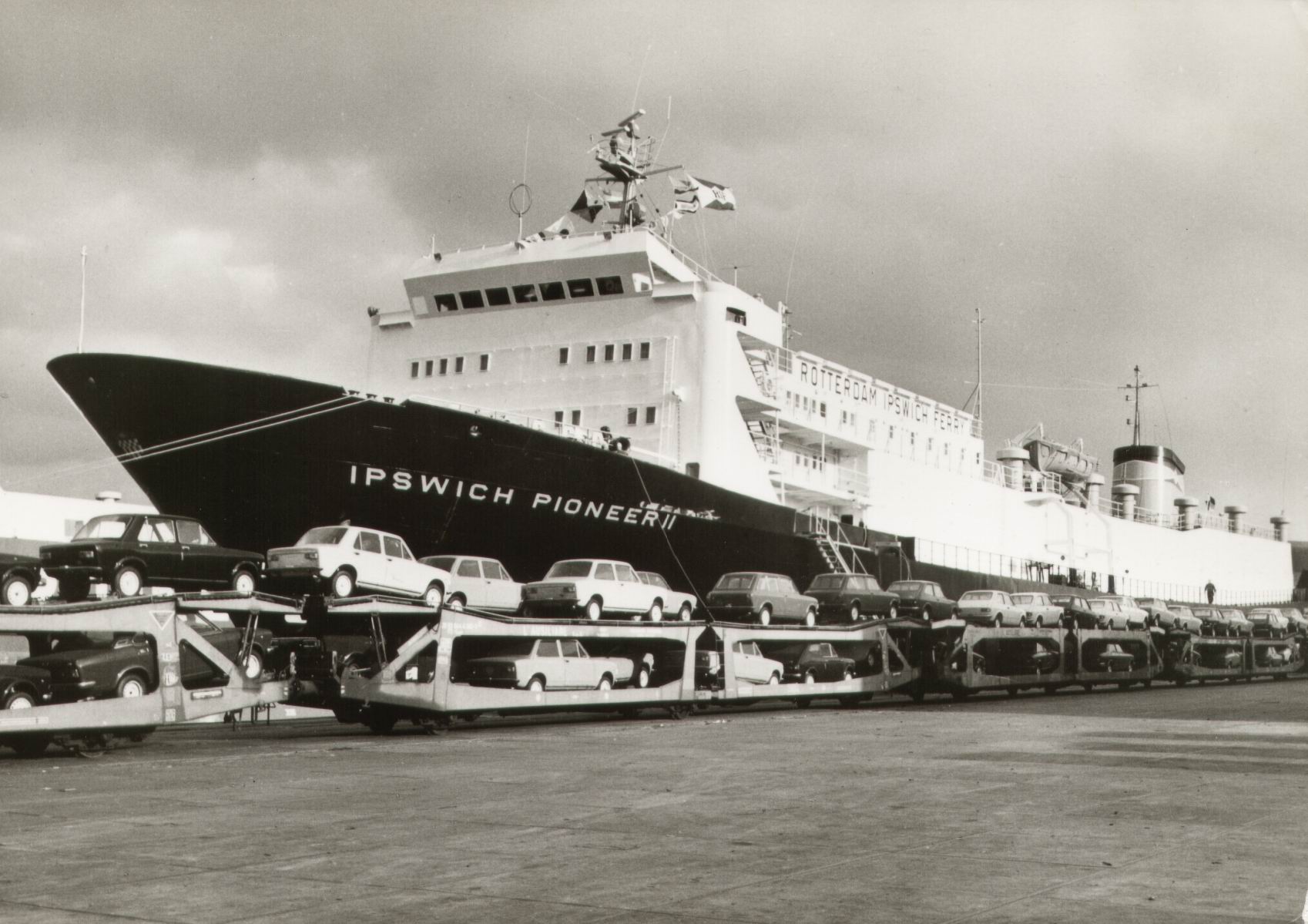 Die Krögerwerft in Rendsburg baute für die Argo Reederei zwischen 1971 und 1976 drei Ro-Ro Schiffe, die alle ursprünglich für die Finnlandfahrt konzipiert waren. Außer der ALGOL von 1972 wurden jedoch die anderen beiden Schiffe in anderen Diensten untergebracht. Die AQUILA fuhr als IPSWICH PIONEER II für die niederländische Argo-Tochter "Rotterdam Ipwich Line" von - na wohin wohl?!. Da die See(?)reise zwischen den beiden Häfen sehr kurz war, machte das Schiff zwei Reisen am Tag und war bei den Seeleuten entsprechend beliebt. Die obige Postkarte zeigt das Schiff auf einer seiner ersten Ausreisen. Ich halte sie - ehrlich gesagt - für grausam schlecht.