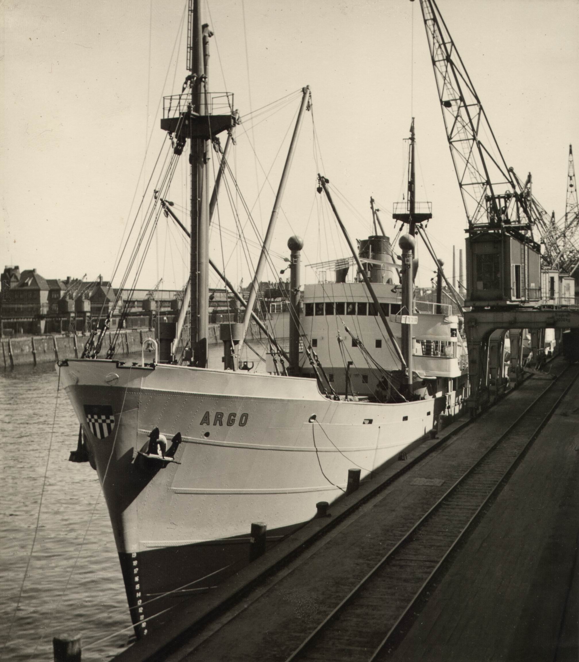 Mit Schiffen wie dem Dampfer ARGO nahm die Reederei nach dem Zweiten Weltkrieg die Levantefahrt wieder auf. Noch nach den Beschränkungen des Potsdamer Abkommens gebaut war die ARGO kaum größer als die ebenfalls beim Bremer Vulkan entstandenen LUMME und ERPEL. Sicher gibt es Abbildungen der ARGO, die mehr vom Schiff zeigen; dennoch gefällt mir dieses Bild ganz besonders gut, da es den Dampfer im Zusammenhang mit einem leeren Hafenbecken zu Beginn der 50er Jahre in einen sehr interessanten Kontext von Schiff und Arbeit stellt. So hängt diese Photographie nun bei mir im Arbeitszimmer.